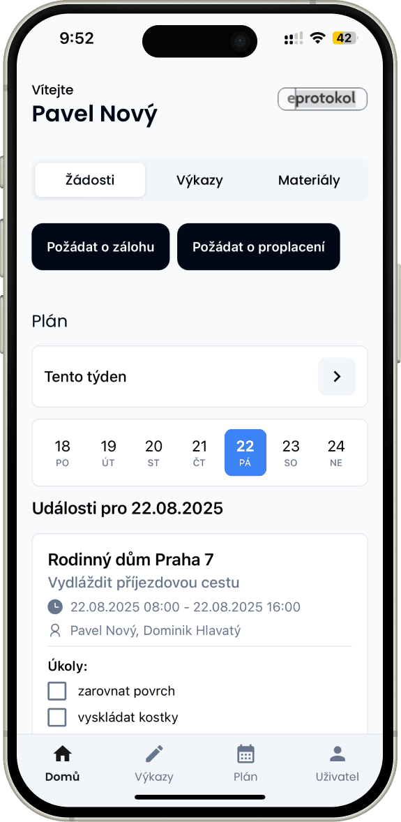 eProtokol Vám pomůže efektivně řídit práci zaměstnanců a detailně sledovat náklady jednotlivých projektů. Naším cílem je vytvořit přehledný systém, který digitalizuje klíčové vnitropodnikové procesy v malých a středních firmách v oblasti stavebnictví a řemeslných profesí. Díky tomu ušetříte čas a získáte dokonalý přehled o dění ve Vaší společnosti – vše máte na dosah ruky.
